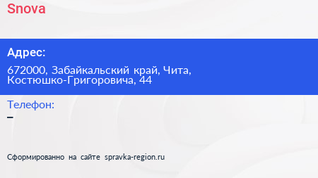 Snova по адресу 672000, Забайкальский край, Чита, Костюшко-Григоровича, 44 в дальнейшем Организация, размещена в следующих категориях: