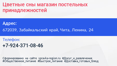 Цветные сны, магазин постельных принадлежностей по адресу 672039, Забайкальский край, Чита, Ленина, 24 в дальнейшем Организация, размещена в следующих категориях:
