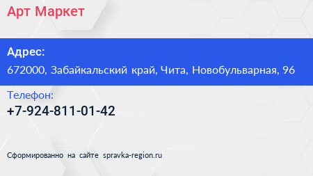 Арт Маркет по адресу 672000, Забайкальский край, Чита, Новобульварная, 96 в дальнейшем Организация, размещена в следующих категориях: