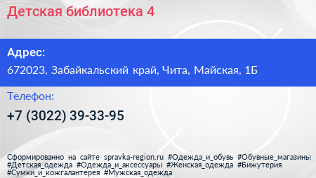 Детская библиотека №4 по адресу 672023, Забайкальский край, Чита, Майская, 1Б в дальнейшем Организация, размещена в следующих категориях: