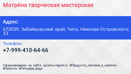 Матрёна, творческая мастерская по адресу 672039, Забайкальский край, Чита, Николая Островского, 13 в дальнейшем Организация, размещена в следующих категориях: