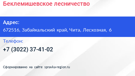 Беклемишевское лесничество по адресу 672516, Забайкальский край, Чита, Лесхозная, 6 в дальнейшем Организация, размещена в следующих категориях: