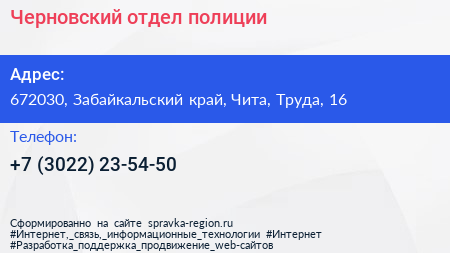 Черновский, отдел полиции по адресу 672030, Забайкальский край, Чита, Труда, 16 в дальнейшем Организация, размещена в следующих категориях: