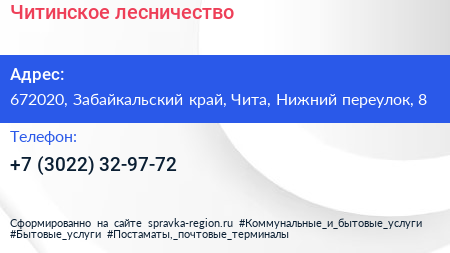 Читинское лесничество по адресу 672020, Забайкальский край, Чита, Нижний переулок, 8 в дальнейшем Организация, размещена в следующих категориях: