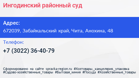 Ингодинский районный суд по адресу 672039, Забайкальский край, Чита, Анохина, 48 в дальнейшем Организация, размещена в следующих категориях: