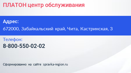 ПЛАТОН, центр обслуживания по адресу 672000, Забайкальский край, Чита, Кастринская, 3 в дальнейшем Организация, размещена в следующих категориях: