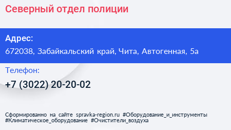 Северный, отдел полиции по адресу 672038, Забайкальский край, Чита, Автогенная, 5а в дальнейшем Организация, размещена в следующих категориях: