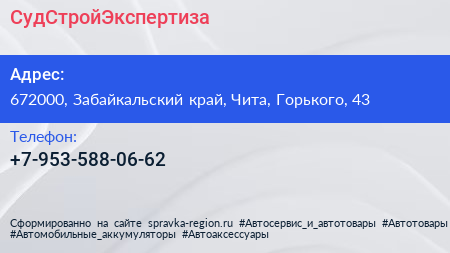 СудСтройЭкспертиза по адресу 672000, Забайкальский край, Чита, Горького, 43 в дальнейшем Организация, размещена в следующих категориях:
