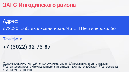ЗАГС Ингодинского района по адресу 672020, Забайкальский край, Чита, Шестипёрова, 66 в дальнейшем Организация, размещена в следующих категориях: