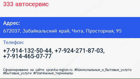 333, автосервис по адресу 672037, Забайкальский край, Чита, Просторная, 95 в дальнейшем Организация, размещена в следующих категориях: