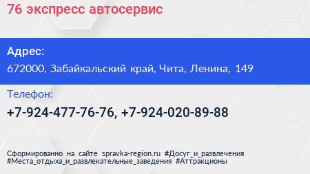 76 экспресс, автосервис по адресу 672000, Забайкальский край, Чита, Ленина, 149 в дальнейшем Организация, размещена в следующих категориях:
