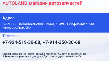 AUTOLAND, магазин автозапчастей по адресу 672038, Забайкальский край, Чита, Геофизический микрорайон, 20 в дальнейшем Организация, размещена в следующих категориях: