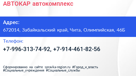 АВТОКАР, автокомплекс по адресу 672014, Забайкальский край, Чита, Олимпийская, 46Б в дальнейшем Организация, размещена в следующих категориях:
