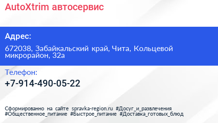 AutoXtrim, автосервис по адресу 672038, Забайкальский край, Чита, Кольцевой микрорайон, 32а в дальнейшем Организация, размещена в следующих категориях:
