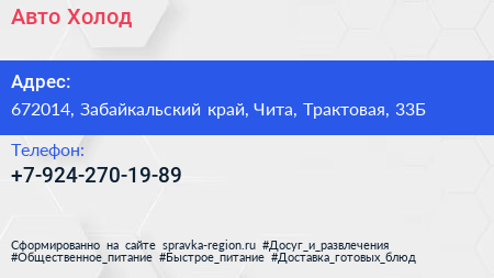 Авто Холод по адресу 672014, Забайкальский край, Чита, Трактовая, 33Б в дальнейшем Организация, размещена в следующих категориях: