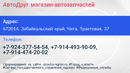 АвтоДруг, магазин автозапчастей по адресу 672014, Забайкальский край, Чита, Трактовая, 37 в дальнейшем Организация, размещена в следующих категориях: