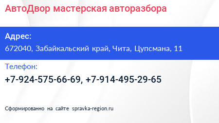 АвтоДвор, мастерская авторазбора по адресу 672040, Забайкальский край, Чита, Цупсмана, 11 в дальнейшем Организация, размещена в следующих категориях: