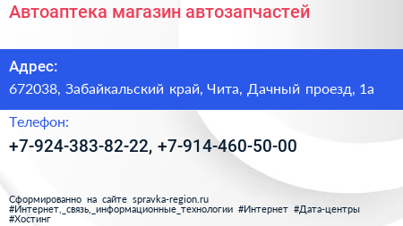 Автоаптека, магазин автозапчастей по адресу 672038, Забайкальский край, Чита, Дачный проезд, 1а в дальнейшем Организация, размещена в следующих категориях: