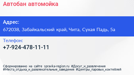 Автобан, автомойка по адресу 672038, Забайкальский край, Чита, Сухая Падь, 5а в дальнейшем Организация, размещена в следующих категориях: