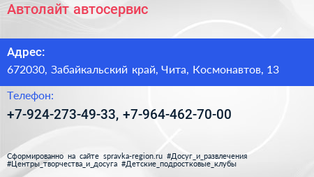 Автолайт, автосервис по адресу 672030, Забайкальский край, Чита, Космонавтов, 13 в дальнейшем Организация, размещена в следующих категориях: