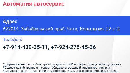 Автомагия, автосервис по адресу 672014, Забайкальский край, Чита, Ковыльная, 19 ст2 в дальнейшем Организация, размещена в следующих категориях: