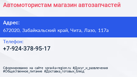 Автомотористам, магазин автозапчастей по адресу 672020, Забайкальский край, Чита, Лазо, 117а в дальнейшем Организация, размещена в следующих категориях: