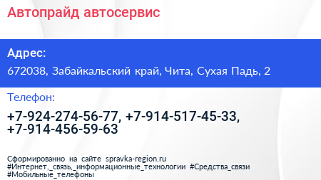 Автопрайд, автосервис по адресу 672038, Забайкальский край, Чита, Сухая Падь, 2 в дальнейшем Организация, размещена в следующих категориях: