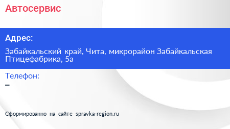 Автосервис по адресу Забайкальский край, Чита, микрорайон Забайкальская Птицефабрика, 5а в дальнейшем Организация, размещена в следующих категориях: