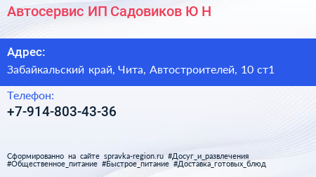 Автосервис, ИП Садовиков Ю.Н. по адресу Забайкальский край, Чита, Автостроителей, 10 ст1 в дальнейшем Организация, размещена в следующих категориях: