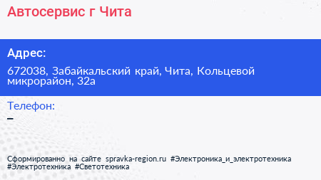 Автосервис, г. Чита по адресу 672038, Забайкальский край, Чита, Кольцевой микрорайон, 32а в дальнейшем Организация, размещена в следующих категориях: