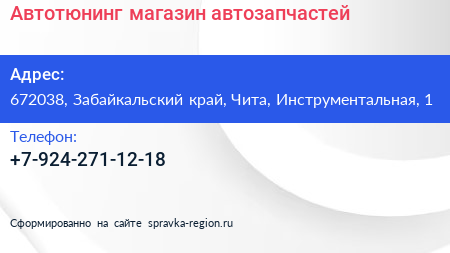 Автотюнинг, магазин автозапчастей по адресу 672038, Забайкальский край, Чита, Инструментальная, 1 в дальнейшем Организация, размещена в следующих категориях: