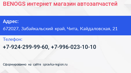 BENOGS, интернет-магазин автозапчастей по адресу 672027, Забайкальский край, Чита, Кайдаловская, 21 в дальнейшем Организация, размещена в следующих категориях: