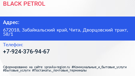 BLACK PETROL по адресу 672018, Забайкальский край, Чита, Дворцовский тракт, 58/1 в дальнейшем Организация, размещена в следующих категориях: