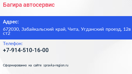Багира, автосервис по адресу 672030, Забайкальский край, Чита, Угданский проезд, 12в ст2 в дальнейшем Организация, размещена в следующих категориях: