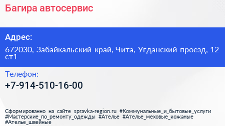 Багира, автосервис по адресу 672030, Забайкальский край, Чита, Угданский проезд, 12 ст1 в дальнейшем Организация, размещена в следующих категориях: