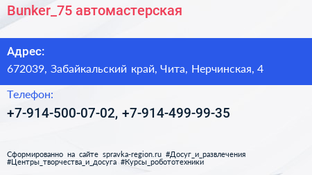 Bunker_75, автомастерская по адресу 672039, Забайкальский край, Чита, Нерчинская, 4 в дальнейшем Организация, размещена в следующих категориях: