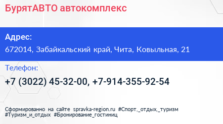 БурятАВТО, автокомплекс по адресу 672014, Забайкальский край, Чита, Ковыльная, 21 в дальнейшем Организация, размещена в следующих категориях: