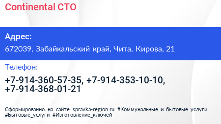 Continental, СТО по адресу 672039, Забайкальский край, Чита, Кирова, 21 в дальнейшем Организация, размещена в следующих категориях: