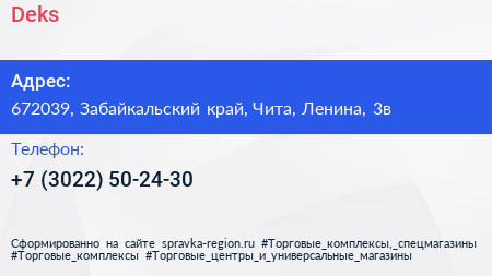 Deks по адресу 672039, Забайкальский край, Чита, Ленина, 3в в дальнейшем Организация, размещена в следующих категориях: