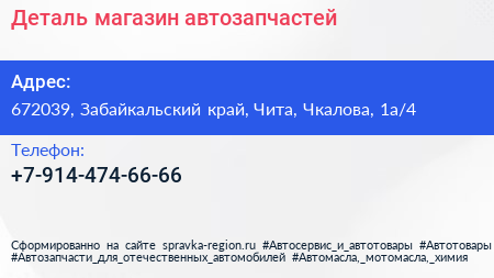 Деталь, магазин автозапчастей по адресу 672039, Забайкальский край, Чита, Чкалова, 1а/4 в дальнейшем Организация, размещена в следующих категориях: