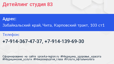 Детейлинг студия 83 по адресу Забайкальский край, Чита, Карповский тракт, 103 ст1 в дальнейшем Организация, размещена в следующих категориях: