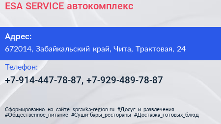 ESA SERVICE, автокомплекс по адресу 672014, Забайкальский край, Чита, Трактовая, 24 в дальнейшем Организация, размещена в следующих категориях: