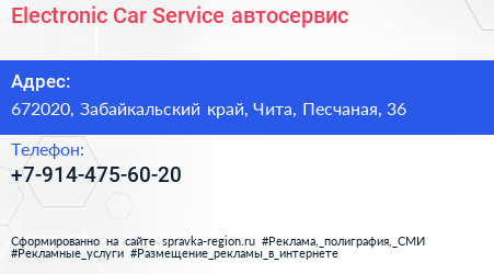 Electronic Car Service, автосервис по адресу 672020, Забайкальский край, Чита, Песчаная, 36 в дальнейшем Организация, размещена в следующих категориях: