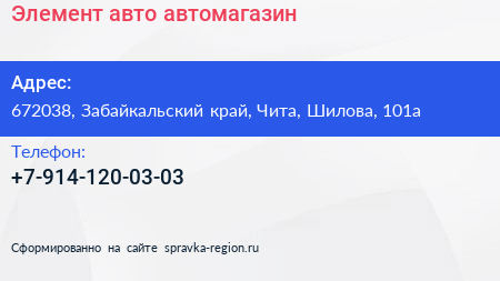 Элемент авто, автомагазин по адресу 672038, Забайкальский край, Чита, Шилова, 101а в дальнейшем Организация, размещена в следующих категориях: