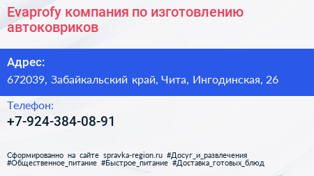 Evaprofy, компания по изготовлению автоковриков по адресу 672039, Забайкальский край, Чита, Ингодинская, 26 в дальнейшем Организация, размещена в следующих категориях: