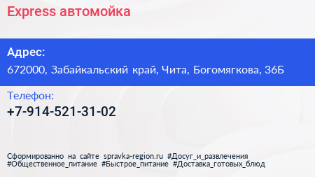 Express, автомойка по адресу 672000, Забайкальский край, Чита, Богомягкова, 36Б в дальнейшем Организация, размещена в следующих категориях: