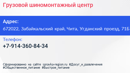 Грузовой шиномонтажный центр по адресу 672022, Забайкальский край, Чита, Угданский проезд, 71Б в дальнейшем Организация, размещена в следующих категориях: