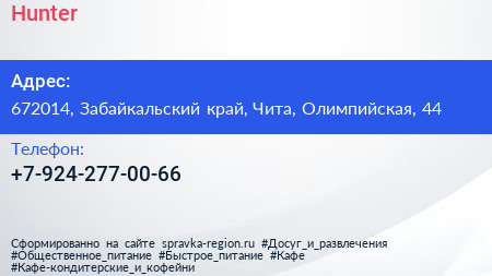 Hunter по адресу 672014, Забайкальский край, Чита, Олимпийская, 44 в дальнейшем Организация, размещена в следующих категориях:
