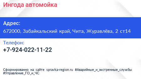 Ингода, автомойка по адресу 672000, Забайкальский край, Чита, Журавлёва, 2 ст14 в дальнейшем Организация, размещена в следующих категориях: