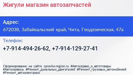 Жигули, магазин автозапчастей по адресу 672038, Забайкальский край, Чита, Геодезическая, 47а в дальнейшем Организация, размещена в следующих категориях: